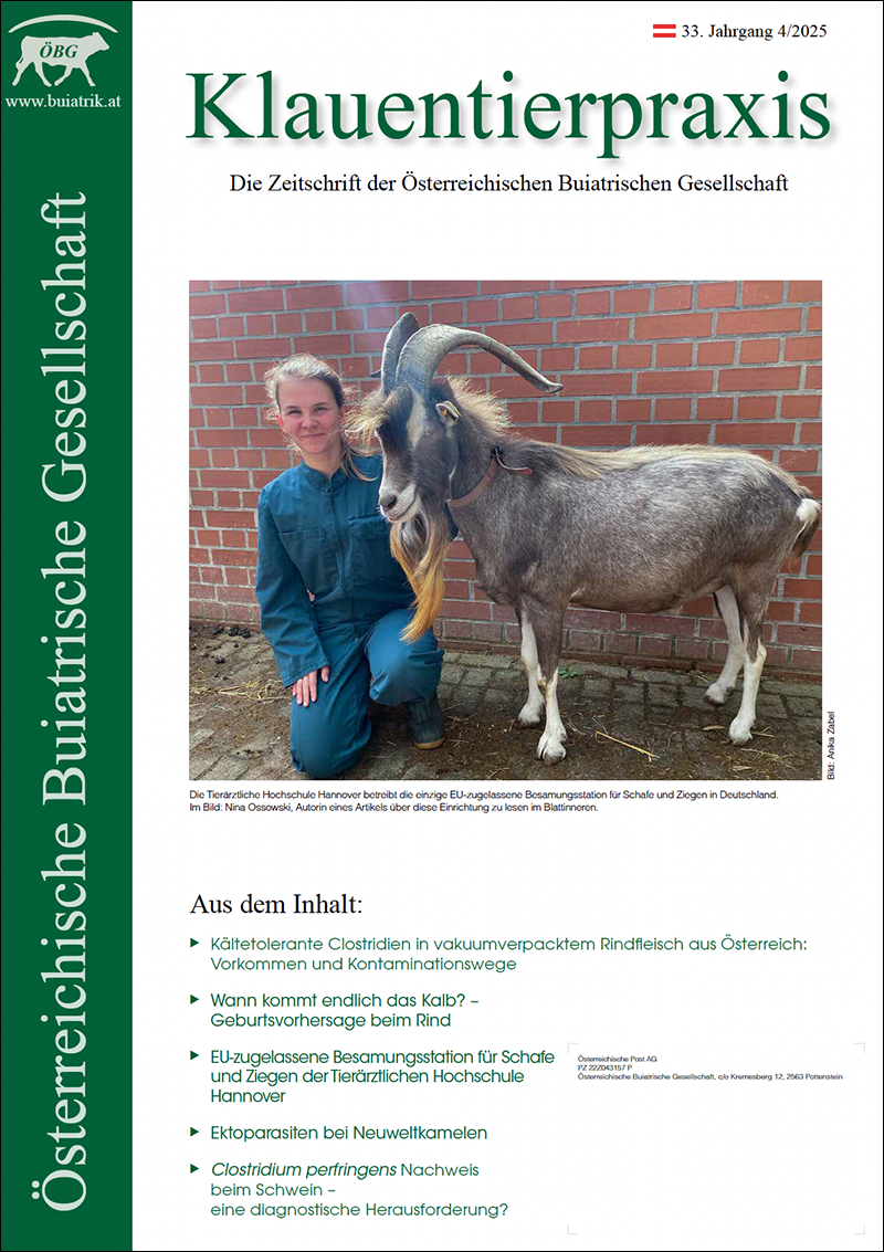 Unsere Ausgabe beginnt mit einem Artikel zum Vorkommen und zu Kontaminationswegen von kältetoleranten Clostridien in vakuumverpacktem Rindfleisch, womit die AutorInnen auf die Bedeutung der Hygiene von geschlachteten Rindern hinweisen möchten. Passend zur Jahreszeit, sofern Sie in einer Region mit saisonalen Abkalbungen praktizieren, wird Ihnen ein Überblick über die Geburtsanzeichen beim Rind und dem Einsatz von Sensortechnologie geboten. Außerdem stellen wir Ihnen die Besamungsstation für kleine Wiederkäuer in Hannover vor. Ein weiteres sehr relevantes Thema sind durch Ektoparasiten bedingte Erkrankungen bei Lamas und Alpakas. Hierbei wurde eine Haarlingsart in Österreich erstmals nachgewiesen.
